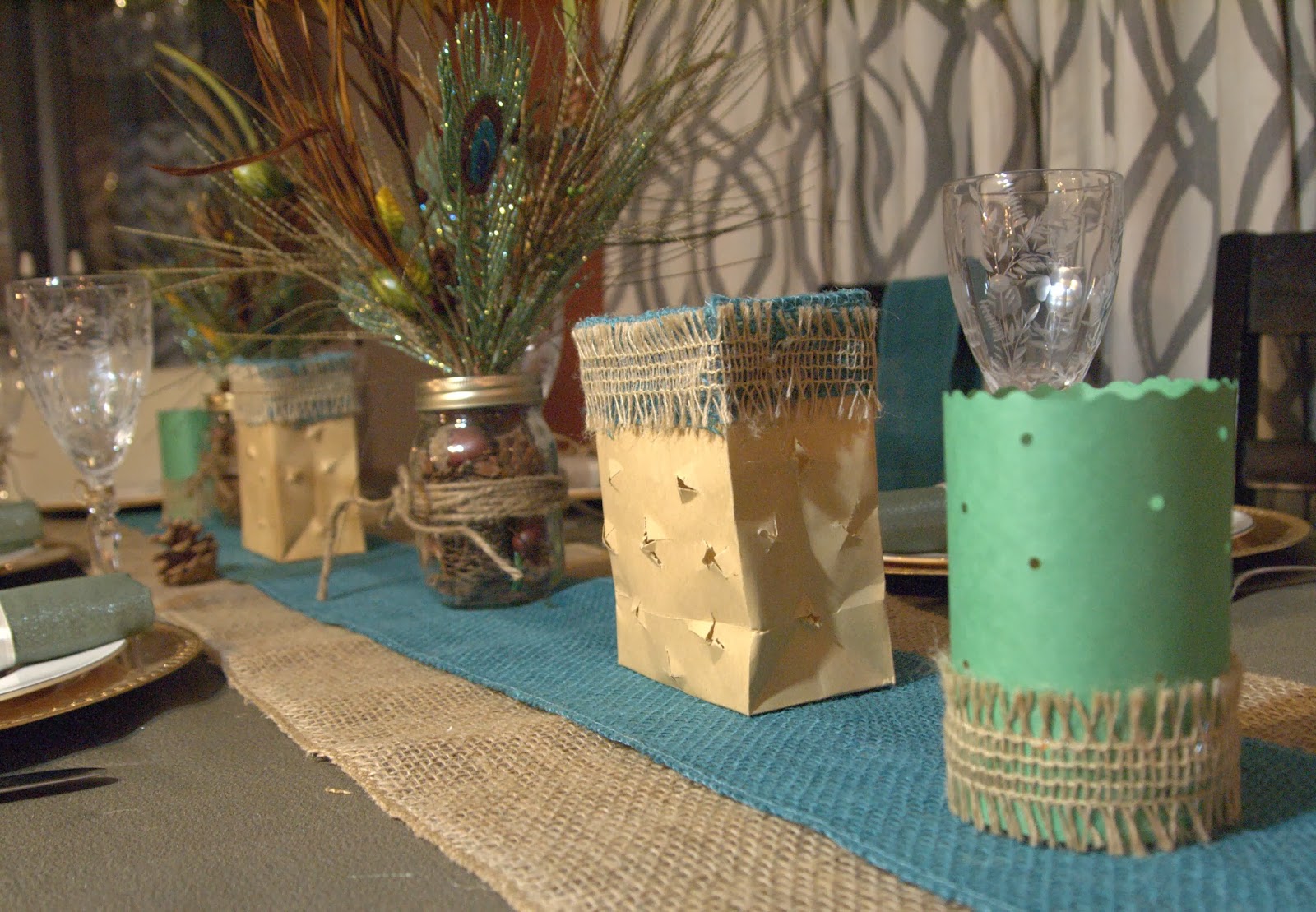 For my table centerpieces I purchased two mason jars at the Dollar Store, and some faux plants and several glittery faux peacock feathers from a craft store. I also bought some pine combs and acorn nuts (you can find them in your local natural outdoor surroundings as well).
