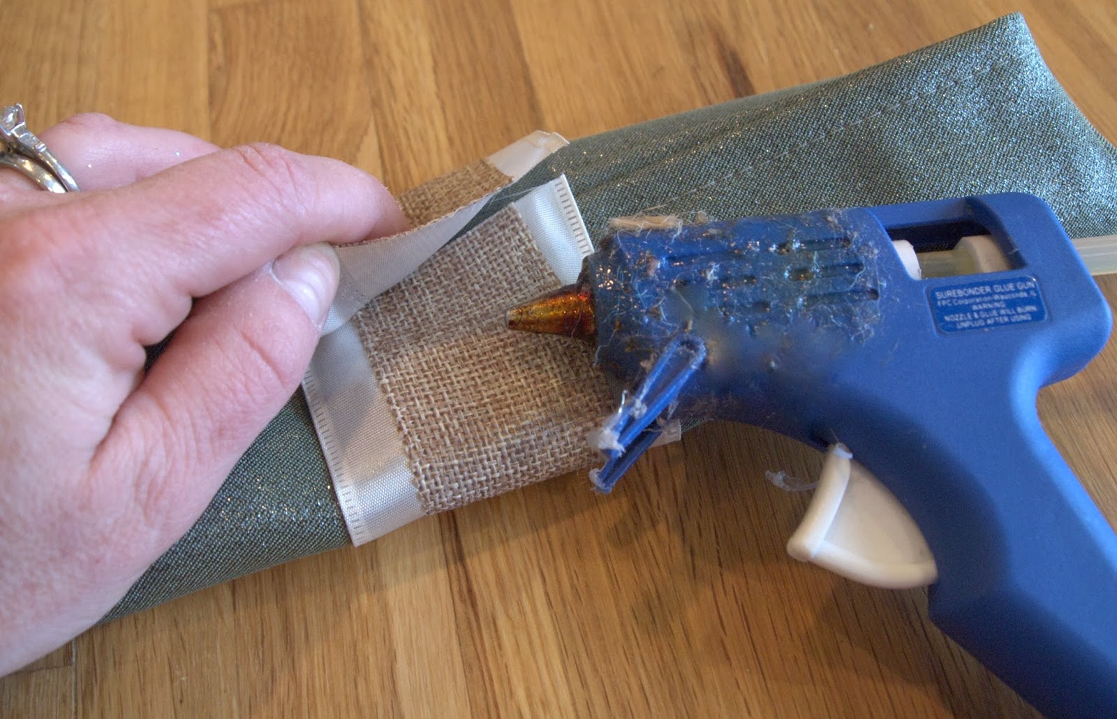 STEP TWO - hot glue the ribbon around the napkin (don't get hot glue on the napkin)