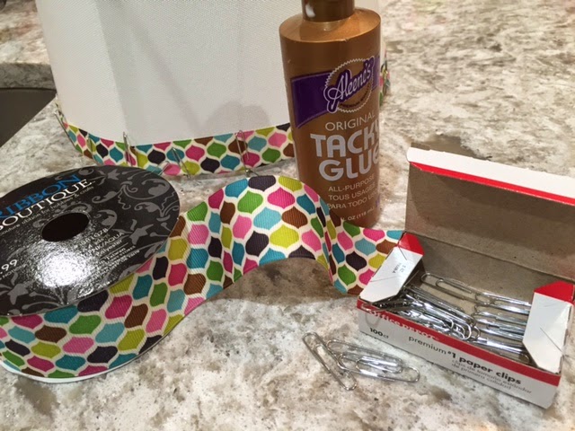 I used a white shade, 1.5" wide ribbon I picked up at Hobby Lobby, tacky glue and a box of paper clips.