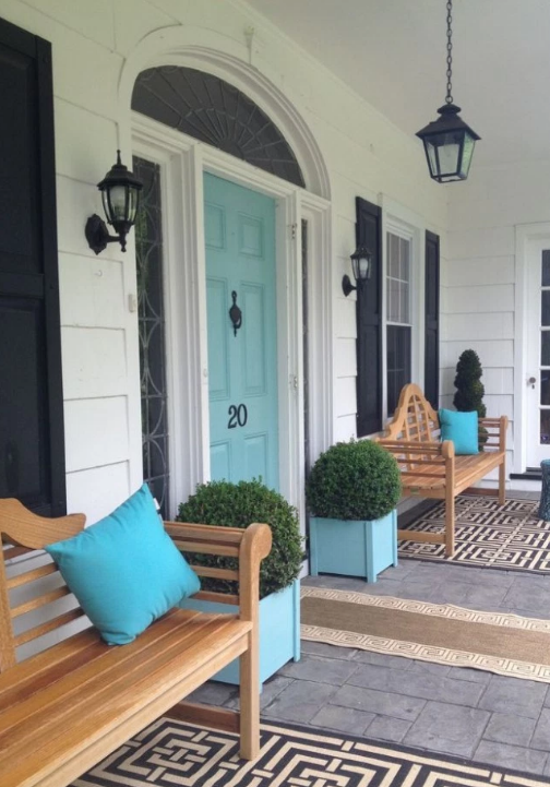 Outdoor front door mats do not need to be boring.  This little detail can add great curb appeal!  I love mats that coordinate with the front door.  It shows the home owner put thought into it.