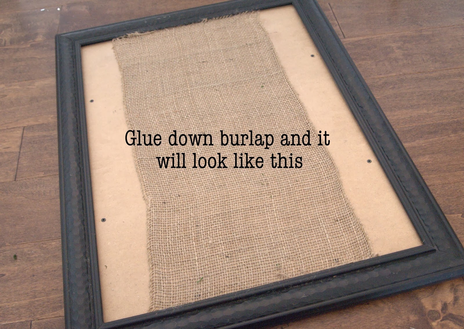 - Spray your adhesive on your burlap piece then place it centered in the frame.