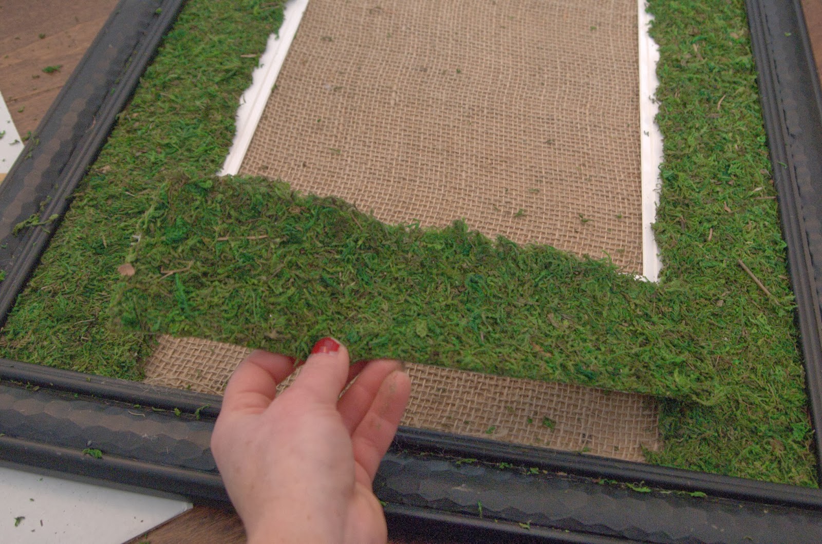 - Spray the back of each long piece of moss and place along the long inside areas of the frame as shown below.STEP 10